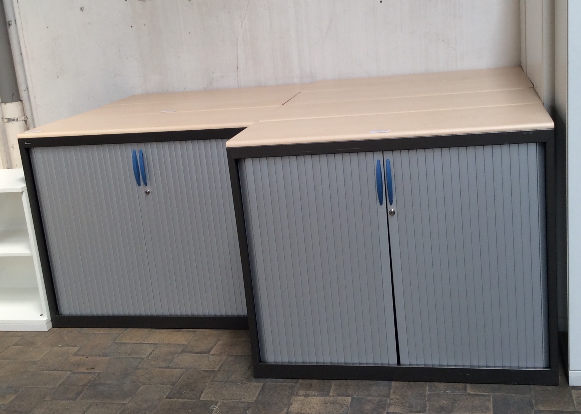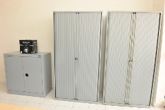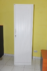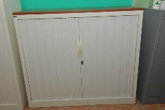 Armoire basse à rideau monobloc de couleur blanche pouvant contenir des dossiers suspendus